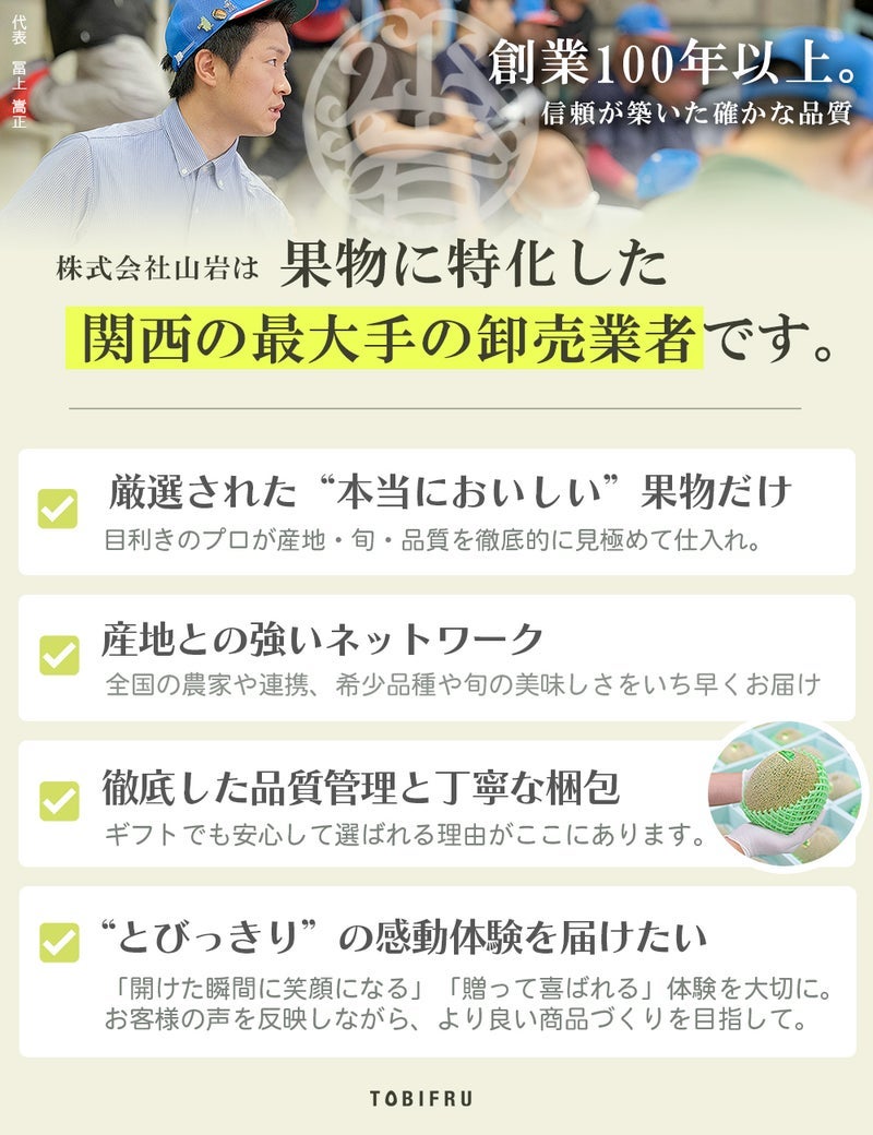 他の画像を見る ネット販売ではTOBIFRUだけの取扱い!「五感で楽しむ至福の苺」をコンセプトに2021年に設立された品質が保証されたブランドいちごです。1~5営業日以内に出荷 三重県津市産いちごあまつおとめ【品種アソートBOX】 8粒入り 送料込み 日時指定不可 クール便 ¥ 11,000 税込 販売期間 2026/02/02 0:00 〜 2026/04/08 23:59 詳細を見る お気に入りに登録する (レビュー:0件)