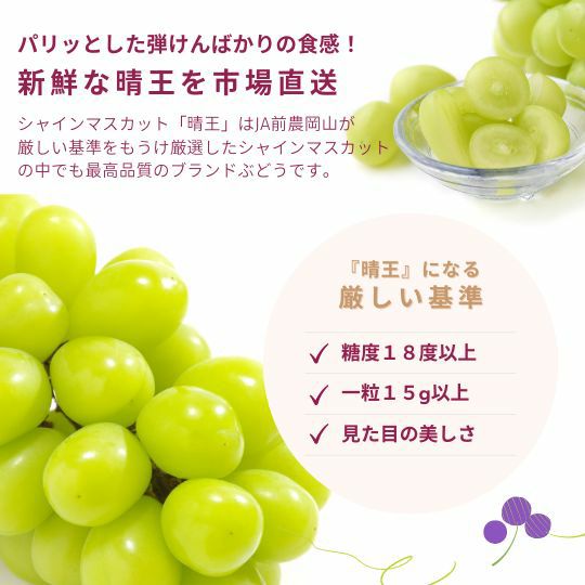 他の画像を見る 青秀ランク以上の「超大房」サイズをお届けします。 【超大房】岡山県産 シャインマスカット晴王 1房入り まもなく販売終了 送料込み 日時指定不可 クール便 参考価格 ¥ 12,980 →特別価格 ¥ 7,980 税込 販売を終了しました。 在庫切れ 詳細を見る お気に入りに登録する 5.00 (レビュー:5件)