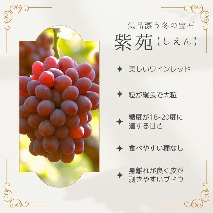 他の画像を見る 美味しい冬ぶどう フルーツ宝石箱 シャインマスカット & 紫苑(しえん) クール便 ¥ 6,480 税込 販売を終了しました。 在庫切れ 詳細を見る お気に入りに登録する (レビュー:0件)