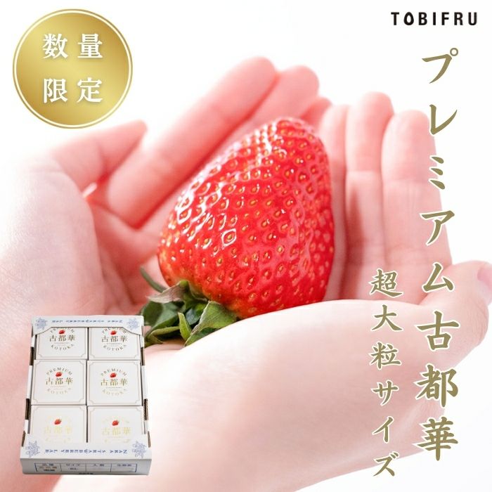 5Lサイズ以上の希少な超大粒サイズのいちごを、金箔押しされた上品なデザインの専用箱にお入れします。1粒入りの箱を6ケースでお届けするため、贈り物としてもおすすめです。