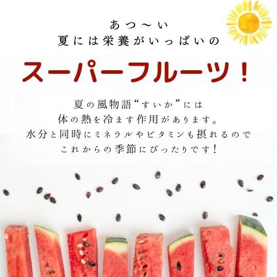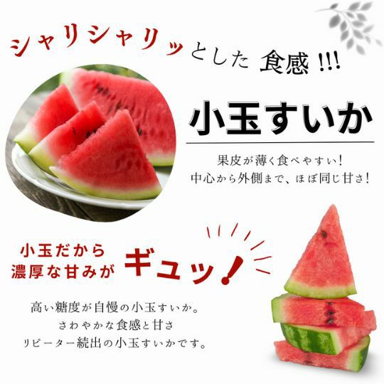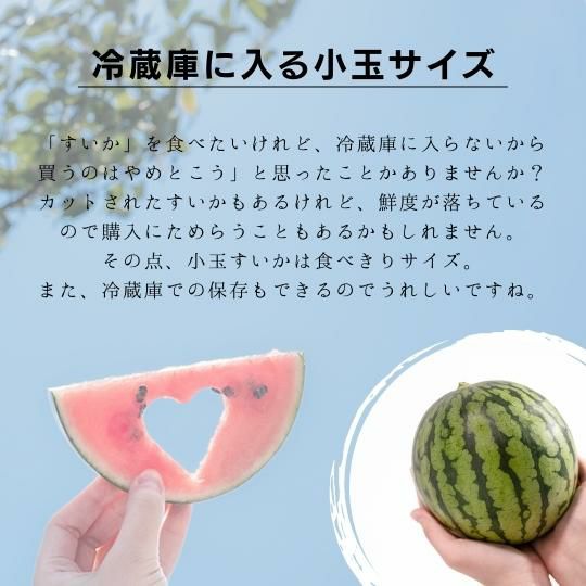 他の画像を見る 冷蔵庫にすっぽり、甘さはたっぷり!4月上旬頃より出荷予定 小玉すいか 1玉入り 送料込み 日時指定不可 予約商品 こちらは予約商品です 参考価格 ¥ 5,980 税込 予約販売価格 ¥ 5,680 税込 予約受付期間 2026/03/03 0:00 〜 2026/04/05 23:59 詳細を見る お気に入りに登録する 4.71 (レビュー:7件)