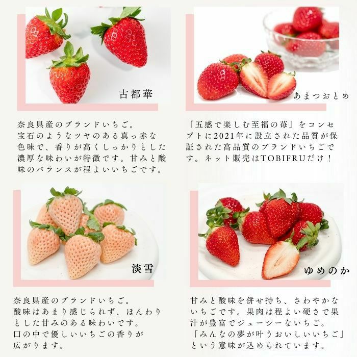 他の画像を見る 当店人気!いちごの食べ比べ。プロが選んだ生産者「奈良いちごラボ」の商品をお届けします。 奈良いちごラボ奈良県産 古都華 & 淡雪 各1パック入り まもなく販売終了 送料込み 日時指定不可 クール便 参考価格 ¥ 9,800 →特別価格 ¥ 8,980 税込 販売期間 2025/12/01 0:00 〜 2026/05/06 23:59 レビュー件数:0件 詳細を見る お気に入りに登録する